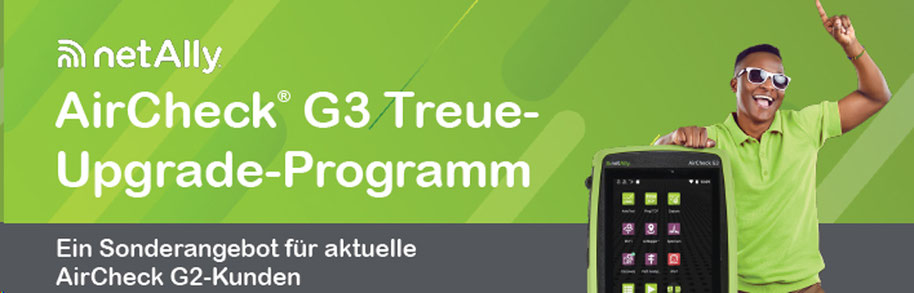 ro AirCheck G2-Seriennummer ist nur ein Upgrade-Gerät zulässig. Für jeden gültigen Kauf eines neuen AirCheck G3 bei einem autorisierten NetAlly-Händler erhalten die Teilnehmer einen Rabatt von 15% auf den empfohlenen Verkaufspreis.Es gelten die Standardgarantien. Dieses Angebot ist nur in bestimmten Ländern gültig. NetAlly behält sich das Recht vor, diese Aktion jederzeit zurückzuziehen und/oder die Bedingungen einseitig zu ändern, ohne jegliche Haftung zu übernehmen. Mitarbeiter und Auftragnehmer von NetAlly, NetAlly-Wiederverkäufer, Distributoren, Value-Added-Reseller oder andere ähnliche Vertriebspartner sind nicht teilnahmeberechtigt. Ungültig,
